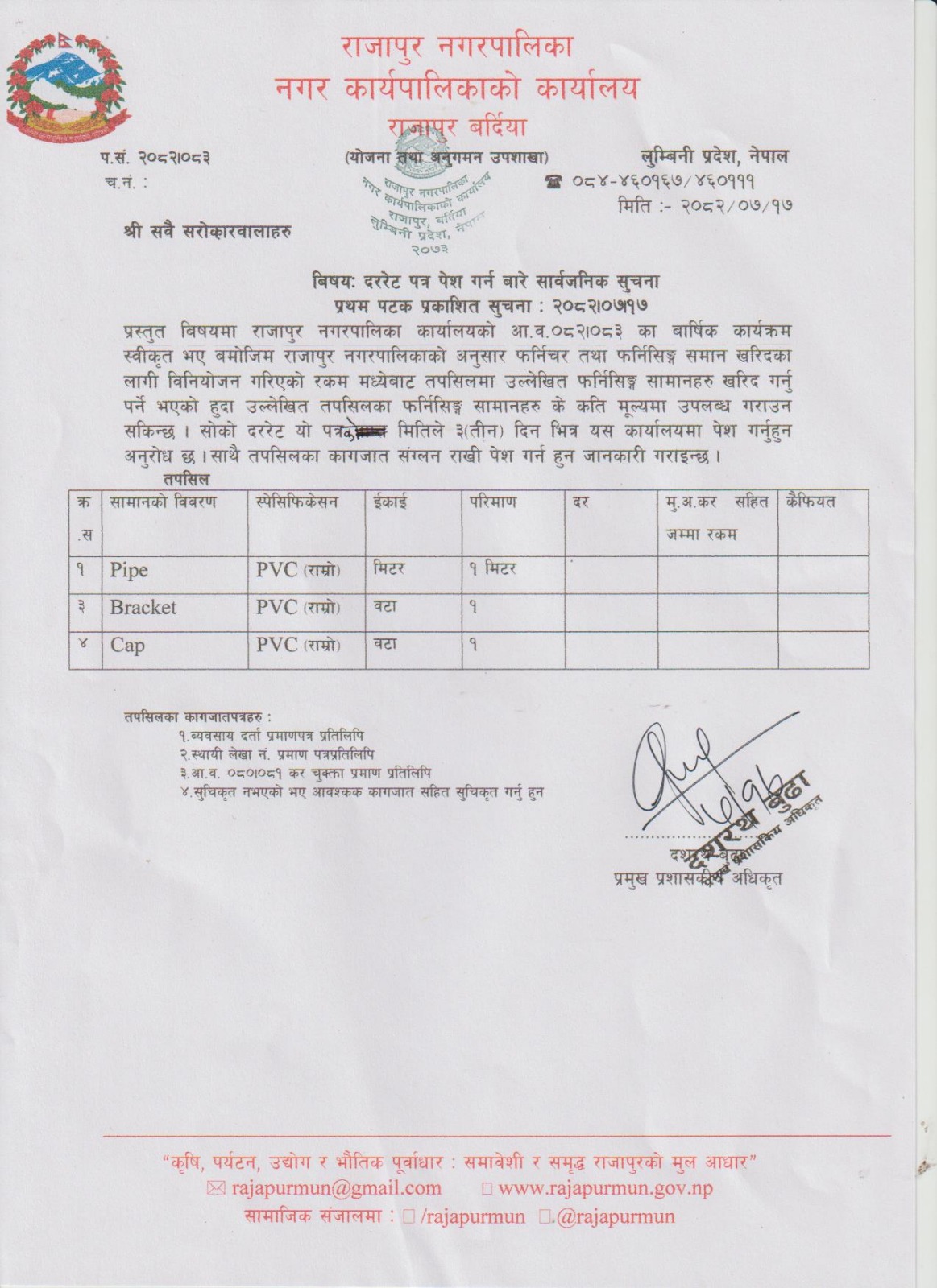 फर्निचर तथा फर्निसिङ्गको दररेट पेश गर्ने सम्बन्धी सूचना ।