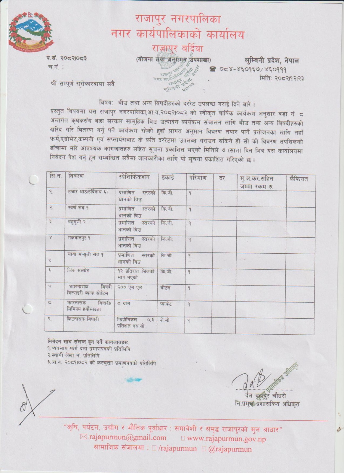 बीउ तथा अन्य विषादीहरुको दररेट सम्बन्धी सूचना ।