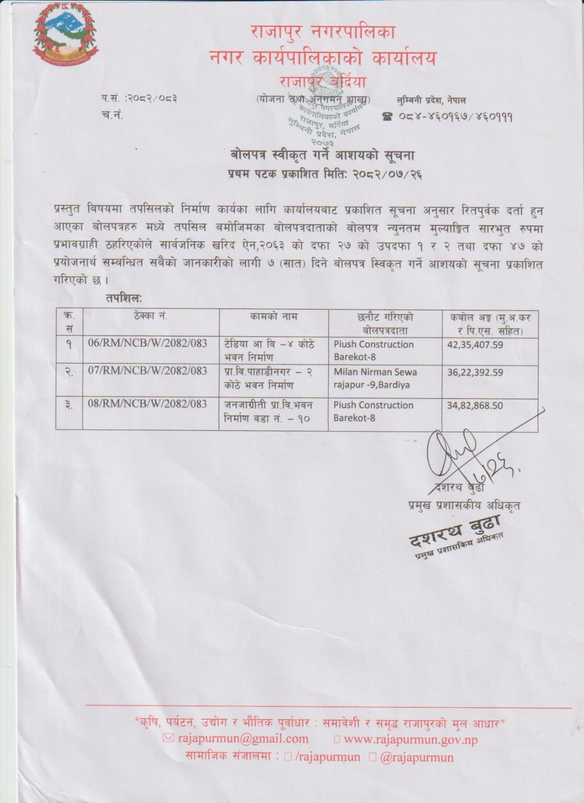 » बोलपत्र स्वीकृत गर्ने आशयको सूचना ।