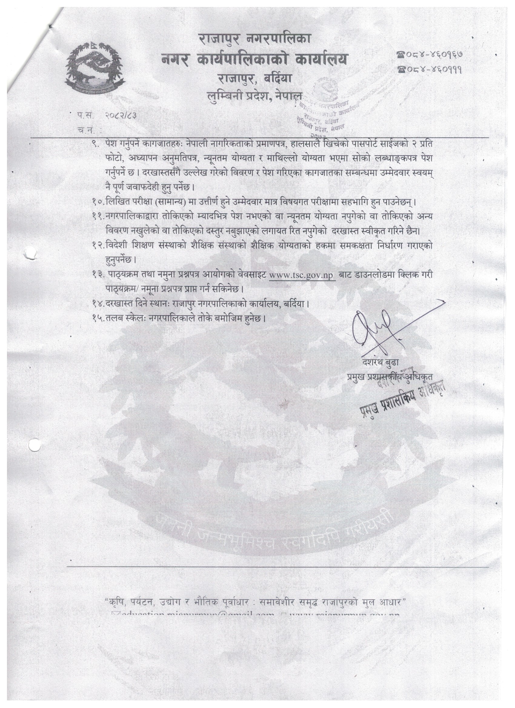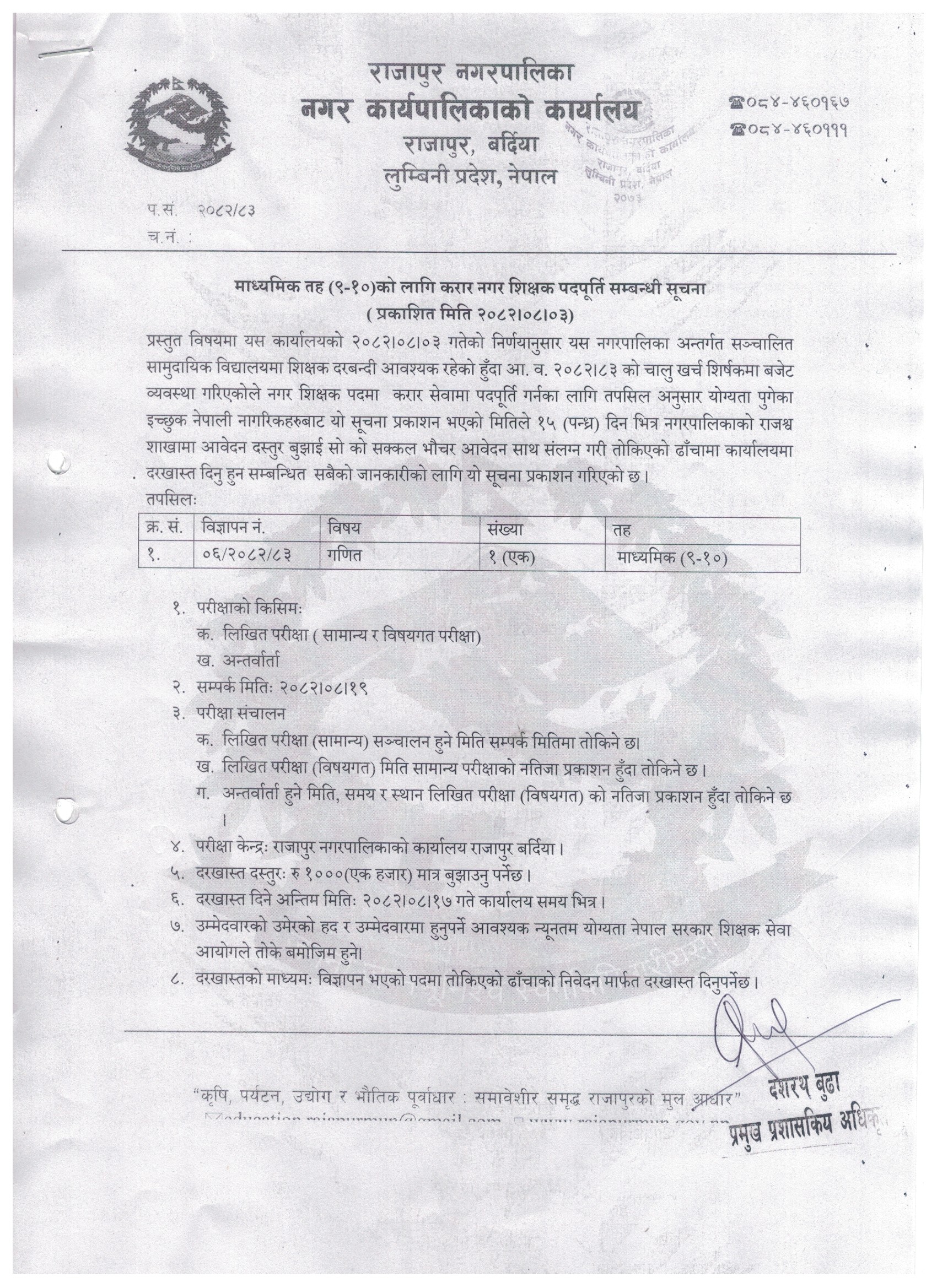 माध्यमिक तह (९-१०) को लागि करार नगर शिक्षक पदपूर्ति सम्बन्धी सूचना ।