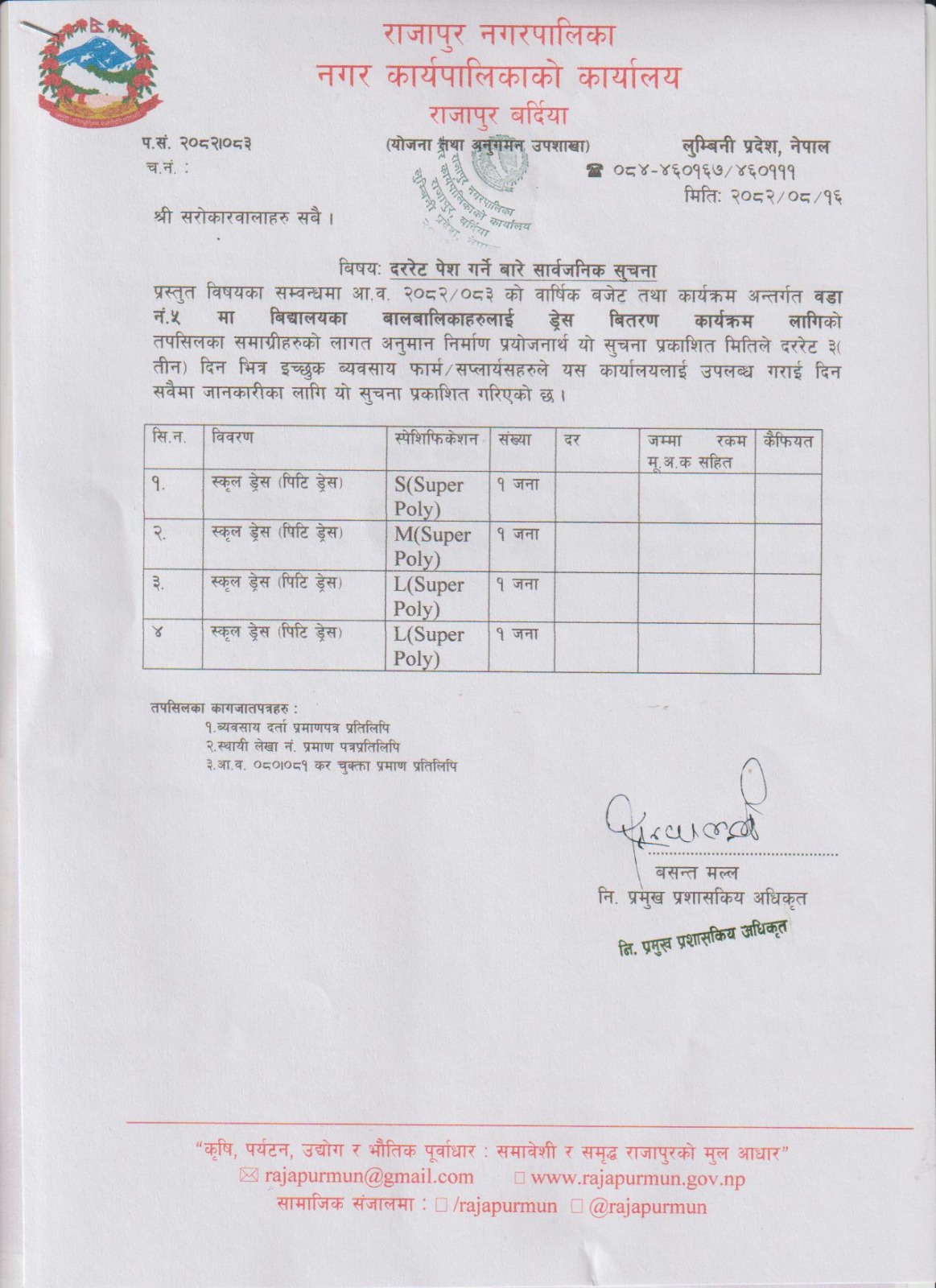 स्कूल ड्रेसको लागि दररेट पेश गर्ने सम्बन्धी सूचना ।