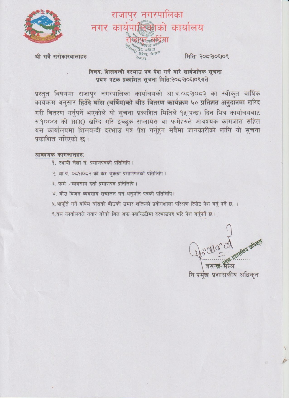 » हिउँदे घाँस (बर्षिम) को शिलबनेदी दरभाउ पत्र पेश गर्ने सम्बन्धी सूचना ।
