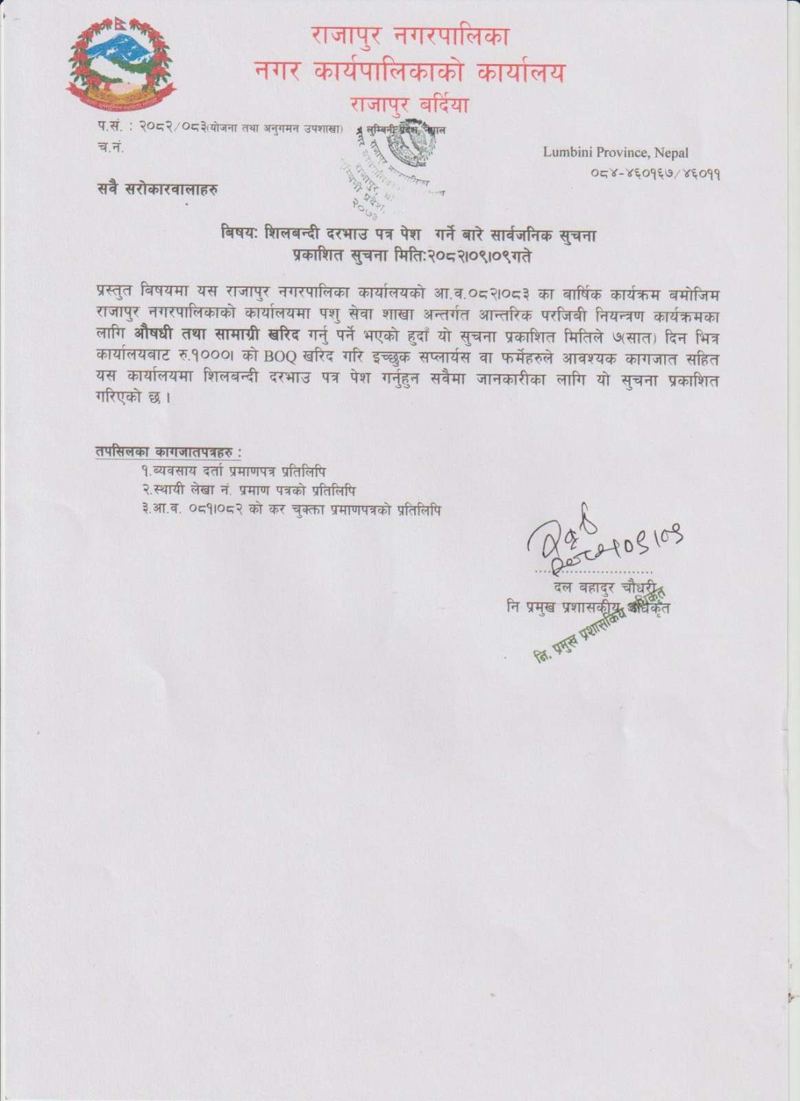 औषधी तथा सामाग्री खरिदका लागी शिलबन्दी दरभाउ पत्र पेश गर्ने सम्बन्धी सूचना।