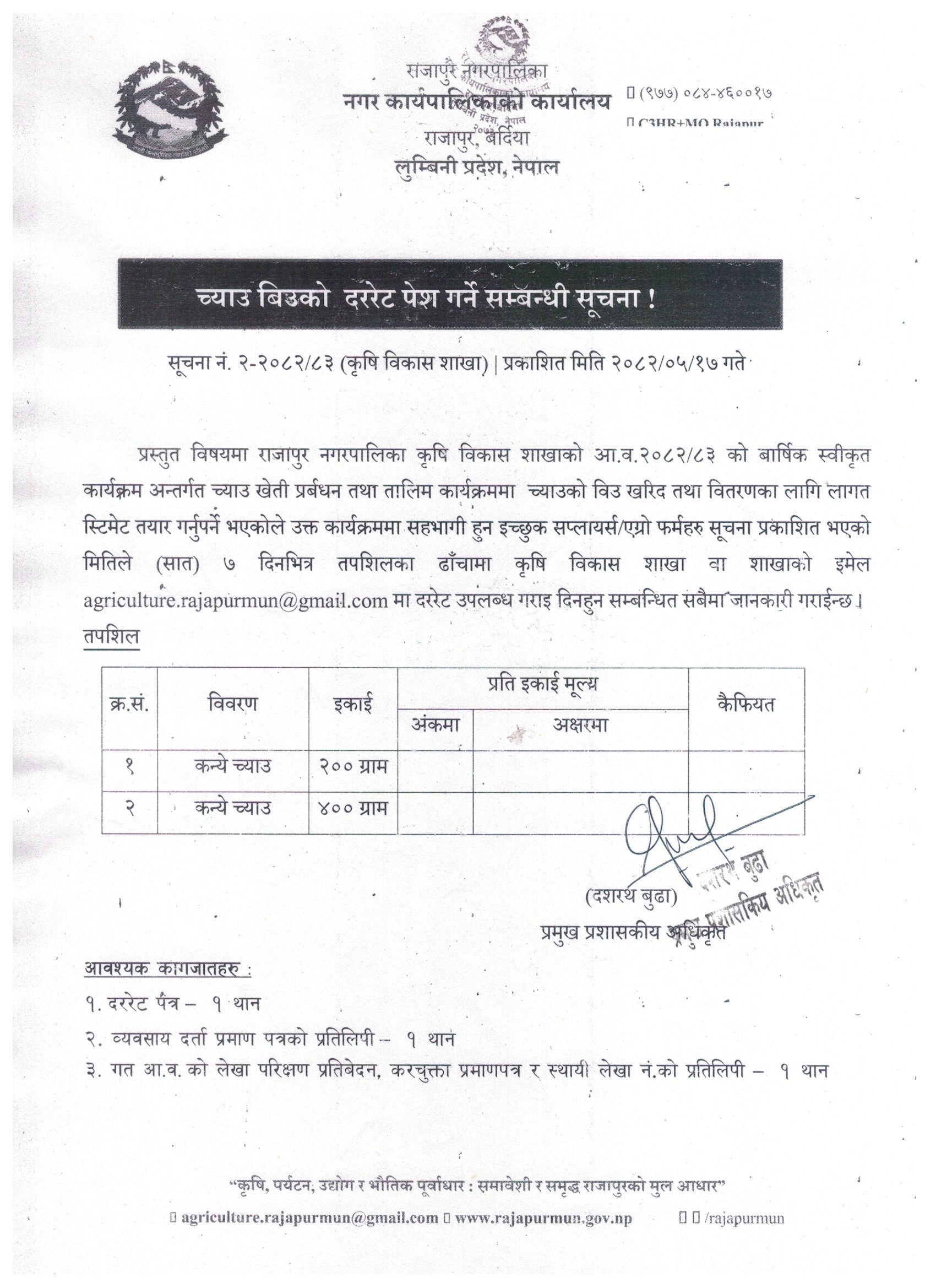 च्याउ बिउको दररेट पेश गर्ने सम्बन्धी सूचना।