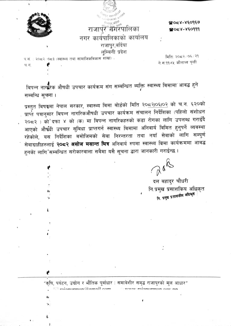 बिपन्न नागरिक औषधी उपचार कार्यक्रमसँग सम्बन्धित ब्यक्ति स्वास्थ्य बिमामा आवद्ध हुने सम्बन्धि सूचना ।
