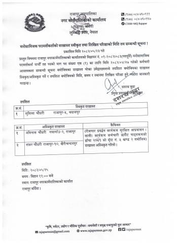 मनोसमाजिक परामर्शकर्ताको दरखास्त स्वीकृत तथा लिखित परिक्षाको मिति तय सम्बन्धी सूचना ।