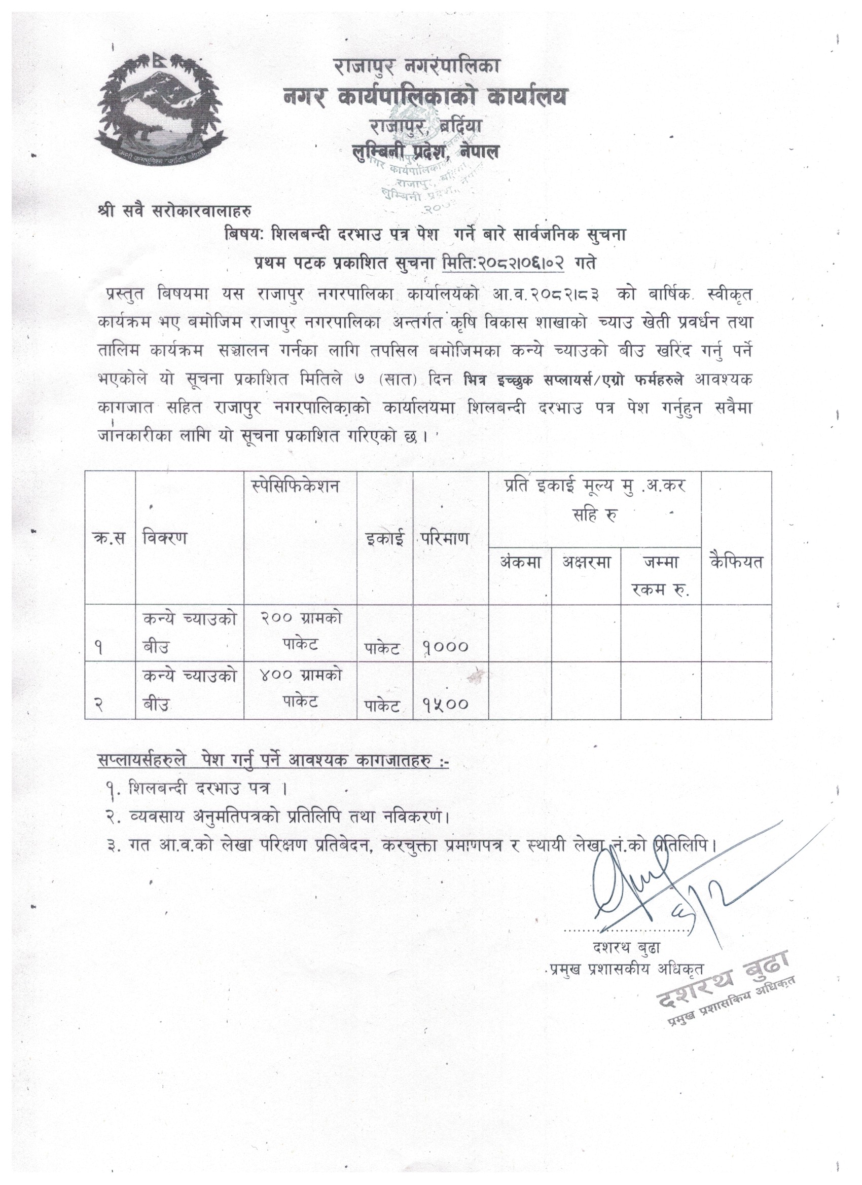 शिलबन्दी दरभाउ पत्र पेश गर्ने बारे सार्वजनिक सूचना।